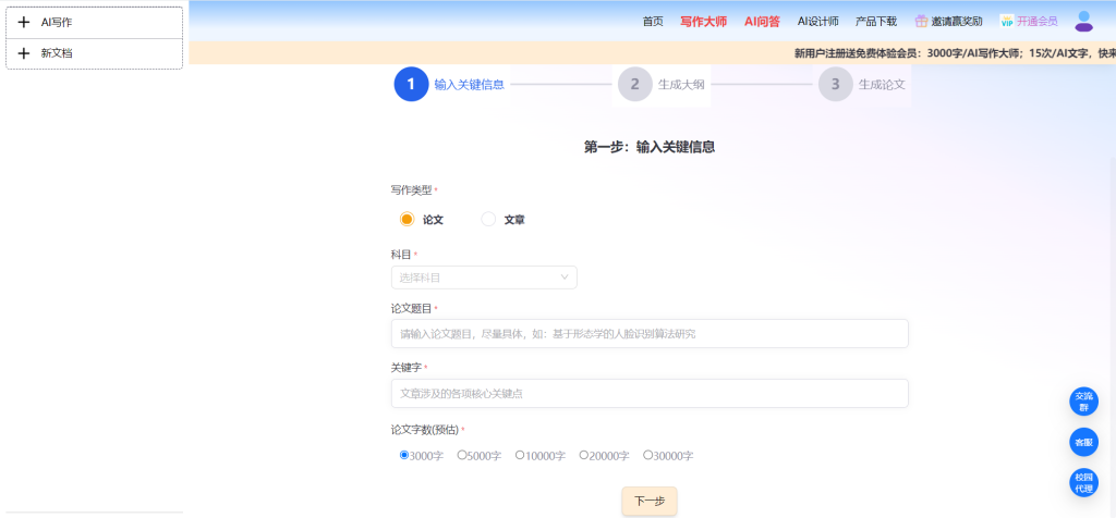 新用户注册送免费体验会员:3000字/AI写作大师;
