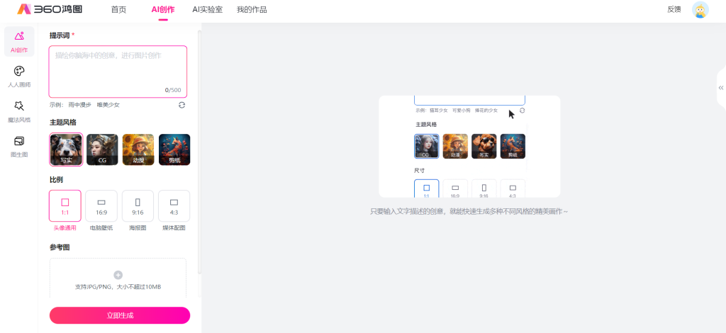 基于360CV大模型衍生出的生成图产品,旨在为用户生成不同风格的需求图片。360鸿图为大家提供了艺术创作的无限可能,只需输入文字描述,就能快速生成。